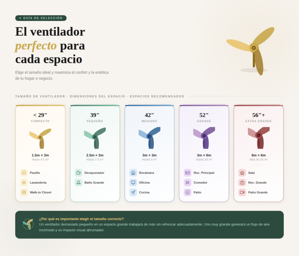 Elegir el ventilador ideal para cada habitación no tiene por qué ser una duda constante. Hemos creado esta guía simple para que encuentres el modelo exacto según el tamaño y estilo de tu espacio.
